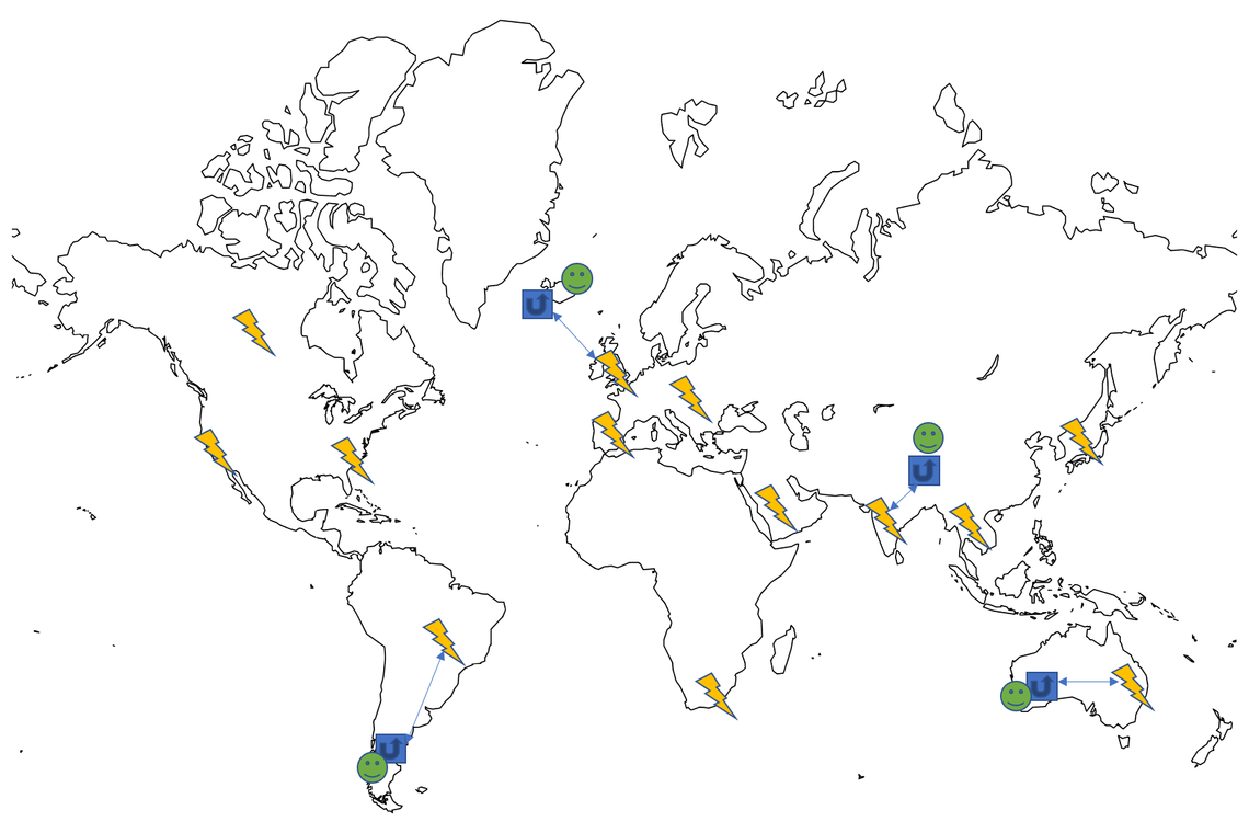 Each user is generally very close to an Azure Front Door endpoint, called a Point of Presence, denoted with the blue redirect boxes. When they call the Azure Front Door URL they get redirected along the Azure backbone, which much better approximates the straight line optimal condition than the normal internet. It then reaches the closest Azure Function, which deals with it and returns the data to the user.